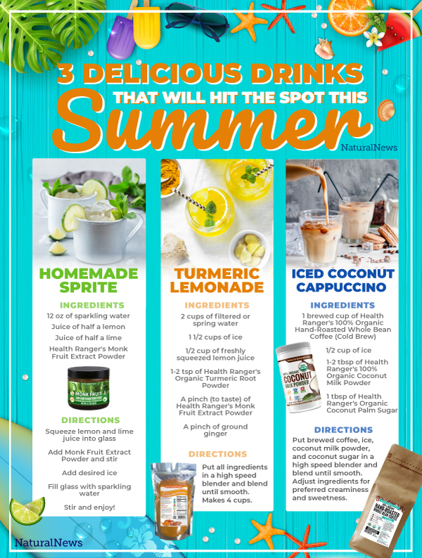 To make a homemade Sprite, simply squeeze in half of a lemon and lime in a glass, add a healthy low glycemic sweetener like the Health Ranger’s Monk Fruit Extract Powder, and stir it in. Then add ice and sparkling water, and stir once more. It’s surprisingly delicious, without the added sugar and synthetic flavors.